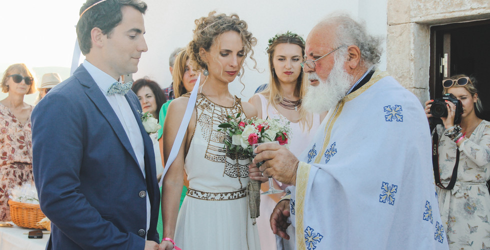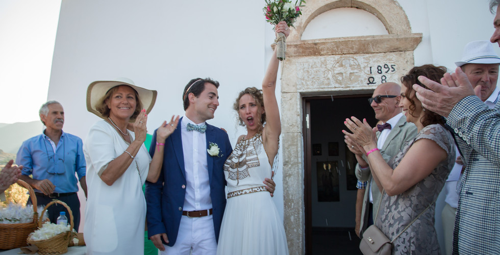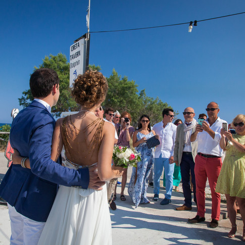 Till the D-day we did not know how exactly we would go to the church. Not that it was a difficult itinerary - our chapel was just five minutes walk from the taverna where we had the cocktail, but our Greek friends told us we would go there "in a Greek traditional way", but they wouldn't reveal more as it was a surprise to us. As a kid before Christmas who is searching for the gifts hidden at home (you didn't do it? I did every year since I got to know that Santa Clause did not exist), I of course asked all the Greek people I knew what a mysterious way they had to go to the church and they all told me that there was nothing special, they usually go tthere by car... I just hoped that I would not have to ride a donkey as it might smell badly. It makes my laugh when I think about it now! When the priest finally arrived, the daughter of one of our Cretan friends, together with her husband, dressed in traditional local clothes, took our hands and we started our wedding march accompanied by the Cretan music. It was not even a traditional Greek way - but an authentically our way!